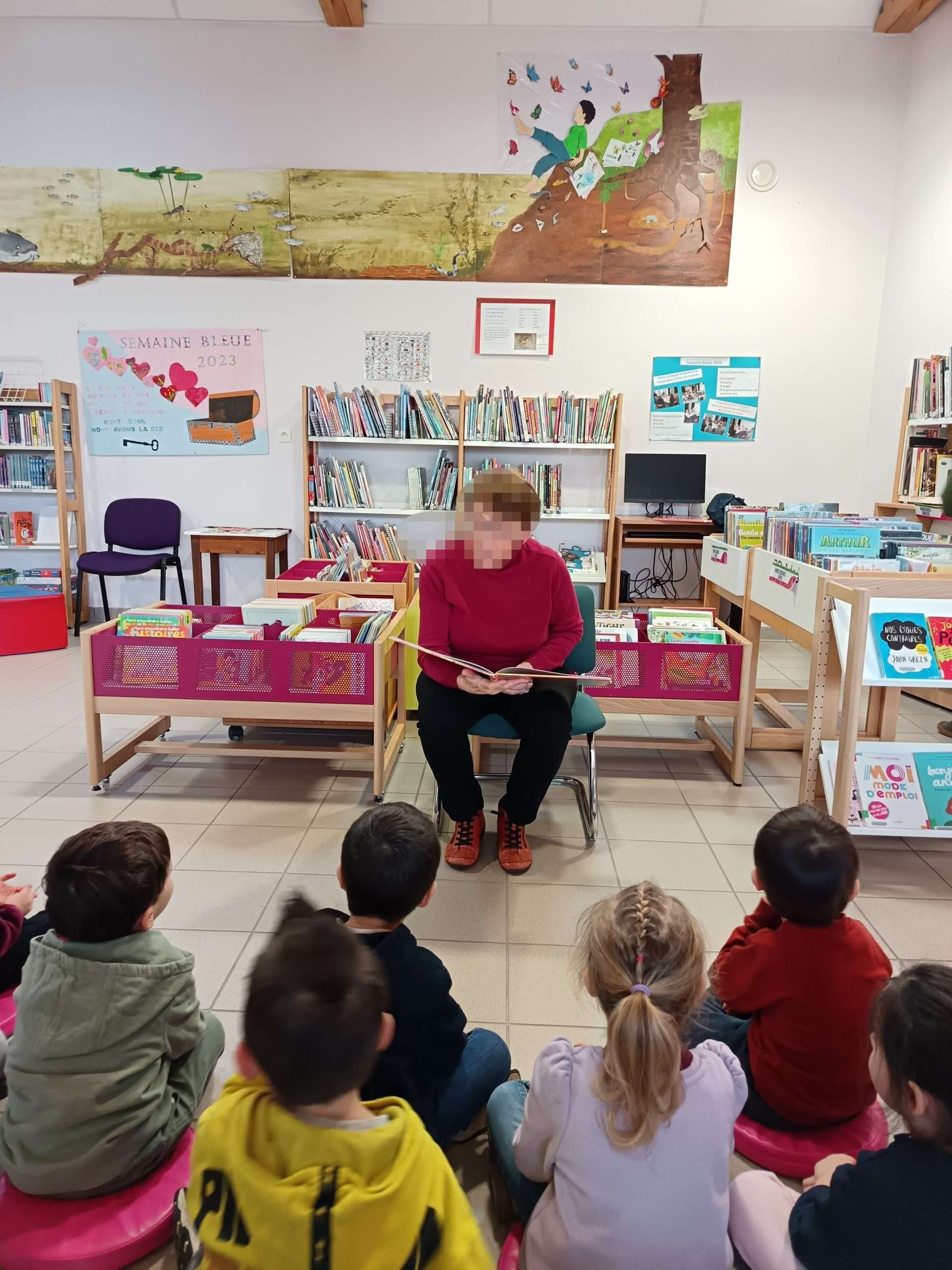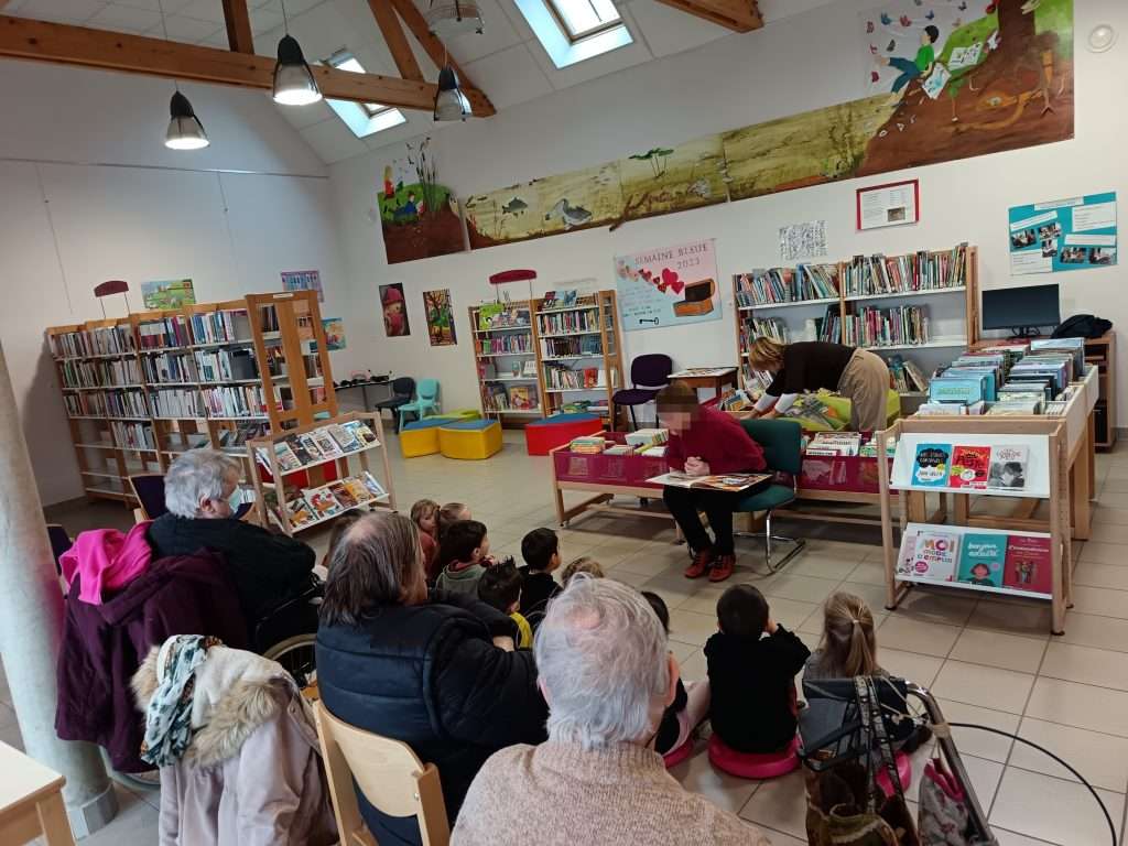 Les rĂ©sidents ont vĂ©cu un agrĂ©able temps de partage autour de la lecture avec les enfants de la classe de maternelle petite et moyenne section de lâĂcole Seguin, Ă la bibliothĂšque de RuillĂ©-sur-Loir đ .