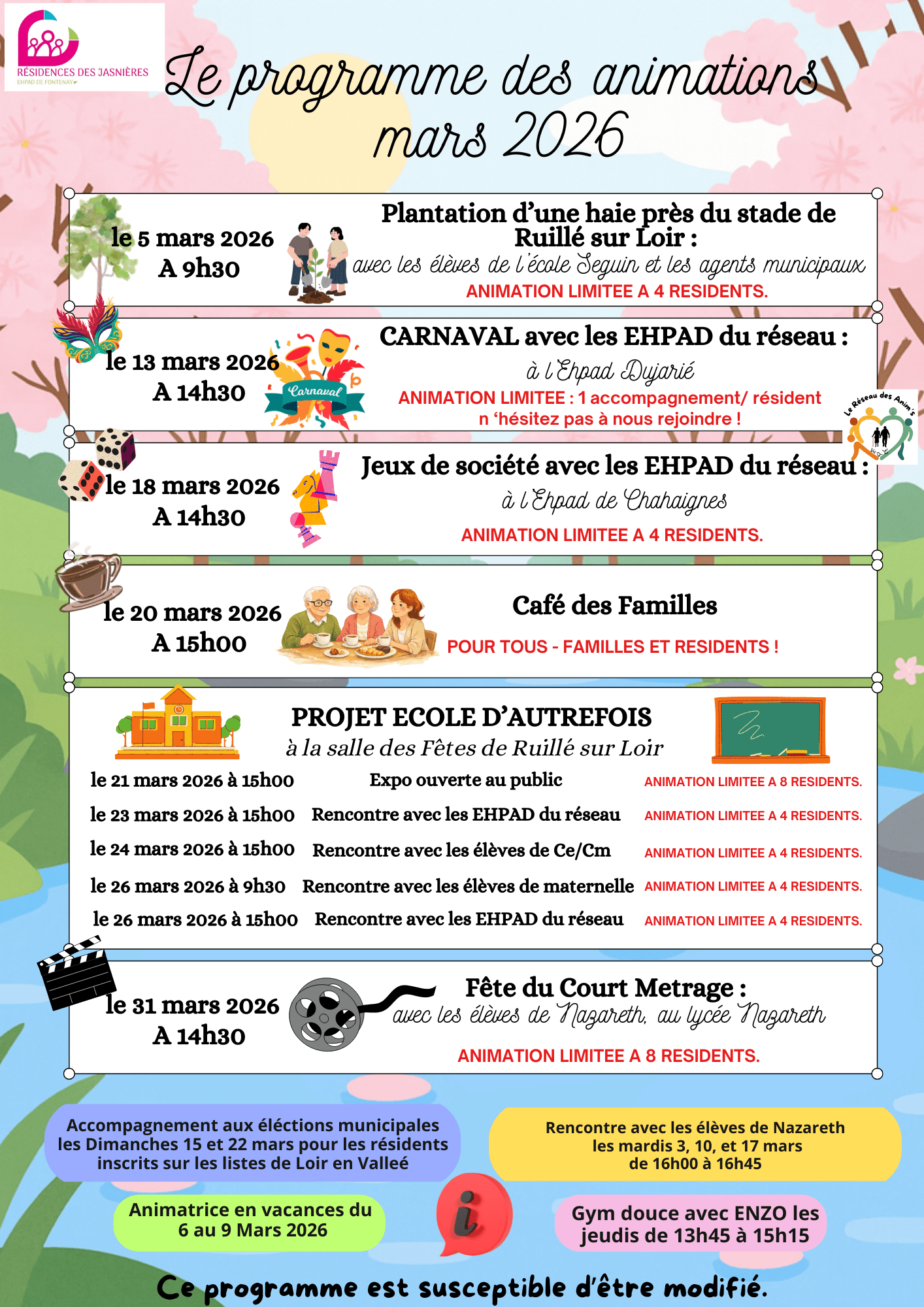 🎉🌷 Le programme des animations de mars est arrivé à l’EHPAD de Fontenay ! 🌷🎉